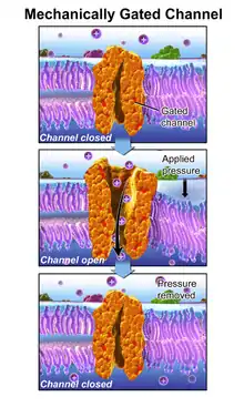 In this process, a mechanically gated ion channel makes it possible for sound, pressure, or movement to cause a change in the excitability of specialized sensory cells and sensory neurons.[9] The stimulation of a mechanoreceptor causes mechanically sensitive ion channels to open and produce a transduction current that changes the membrane potential of the cell.[10] Typically the mechanical stimulus gets filtered in the conveying medium before reaching the site of mechanotransduction.[11] Cellular responses to mechanotransduction are variable and give rise to a variety of changes and sensations. Broader issues involved include molecular biomechanics.