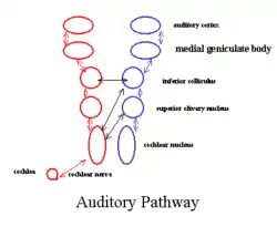 ![]() Auditory pathway (Medial geniculate body labeled at upper right, second from top) | |