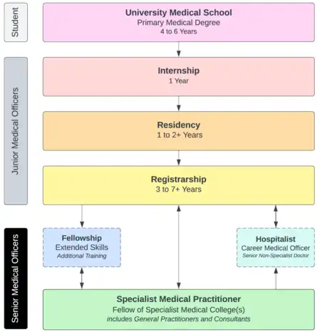 The education and training requirements of a medical practitioner from starting medical school to completing specialist training typically takes between 9 years to 16 years (or more) assuming full-time study and work, and dependent on the specialty choice and satisfying in-training requirements. In Australia, medical practitioners typically pursue a career pathway to become a Specialist Medical Practitioner with the endpoint of working as either a General Practitioner or Consultant. There is a small subset of medical practitioners who decide not to formally complete registrarship nor attain fellowship qualification, and instead opt for a career as non-specialist medical practitioners, which are known as Career Hospital Doctors or Career Medical Officers; non-specialist medical practitioners can typically work with a reasonable level of autonomy and independence dependent on their experience and skill, but nonetheless under the auspicies of a Specialist Medical Practitioner.