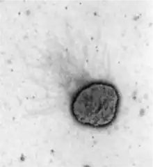| Electron micrograph of Methanococcus maripaludis' showing prominent archaella features and interior body. Courtesy of Dr. Ken F. Jarrell and Shin-Ichi Aizawa. Mag bar of 500nm. | |