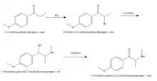 - A reaction with methylamine in which the 2-bromo-1-(4-methoxyphenyl)propan-1-one becomes 1-(4-methoxyphenyl)-2-(methylamino)propan-1-ol.