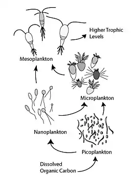 In general, dissolved organic carbon (DOC) is introduced into the ocean environment from bacterial lysis, the leakage or exudation of fixed carbon from phytoplankton (e.g., mucilaginous exopolymer from diatoms), sudden cell senescence, sloppy feeding by zooplankton, the excretion of waste products by aquatic animals, or the breakdown or dissolution of organic particles from terrestrial plants and soils.[2] Bacteria in the microbial loop decompose this particulate detritus to utilize this energy-rich matter for growth. Since more than 95% of organic matter in marine ecosystems consists of polymeric, high molecular weight (HMW) compounds (e.g., protein, polysaccharides, lipids), only a small portion of total dissolved organic matter (DOM) is readily utilizable to most marine organisms at higher trophic levels. This means that dissolved organic carbon is not available directly to most marine organisms; marine bacteria introduce this organic carbon into the food web, resulting in additional energy becoming available to higher trophic levels. Recently the term "microbial food web" has been substituted for the term "microbial loop".