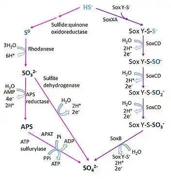 - The aforementioned Sox pathway, through which both sulfur atoms in thiosulfate are oxidized to sulfate without the formation of any free intermediate.[37][38][39]