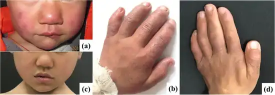 Nakajo syndrome, also called nodular erythema with digital changes,[1] is a rare autosomal recessive congenital disorder first reported in 1939 by A. Nakajo in the offspring of consanguineous (blood relative) parents.[2][3] The syndrome can be characterized by erythema (reddened skin), loss of body fat in the upper part of the body, and disproportionately large eyes, ears, nose, lips, and fingers.[1]