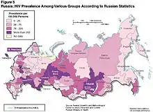 Each country in the second wave have different social factors causing increased spread.[7] HIV has not yet made a move into the general populations of some countries, such as Russia. The single social factor (80–90% of new cases) for Russian spread is IVDA, coming from prostitutes and prison inmates—many of whom are IVDAs—are contributing to the spread of the disease. Drug use is so widespread that many users are integrated into society with jobs and families, suggesting the disease is moving into the mainstream. An estimated 20–25% of IVDA in prison, where there is easy access to drugs, are seropositive.[7]
