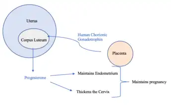 Human chorionic gonadotropin (hCG) is a hormone produced by the placenta during pregnancy.[5] This hormone stimulates the Corpus Luteum to produce progesterone to maintain pregnancy.[5] Therefore, hCG plays a role in human maternal recognition of pregnancy.[5]