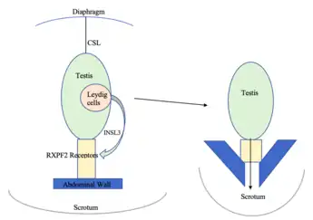INSL3 is responsible for the first phase of testicular descent in males and may be disrupted in cases of cryptorchidism.[3] It also acts as a measure of Leydig cell function, particularly in older males.[3]