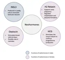 Neohormones are a group of recently evolved hormones primarily associated to the success of mammalian development.[1] These hormones are specific to mammals and are not found in other vertebrates[1]—this is because neohormones are evolved to enhance specific mammalian functions.[2] In males, neohormones play important roles in regulating testicular descent (the testes descend into the scrotum during foetal development) and preparing the sperm for internal fertilisation (the sperm fertilizes the egg within the female).[3] In females, neohormones are essential for regulating early pregnancy, mammary gland development lactation (secretion of milk from the mammary gland), and viviparity (allowing the fertilized egg to grow inside the female until they can exist independently).[1][2] Neohormones superimpose their actions on the hypothalamic-pituitary-gonadal axis (a hormone system which regulates key reproductive functions in animals) and are not associated with other core bodily functions.[2]