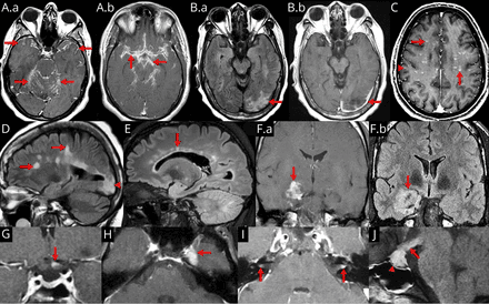 MRI with gadolinium enhancement is the most useful neuroimaging test. This may show enhancement of the pia mater or white matter lesions that may resemble the lesions seen in multiple sclerosis.[1]