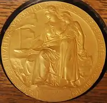 The Physiology and Medicine medal has a portrait of Alfred Nobel in left profile on the obverse.[22] The medal was designed by Erik Lindberg.[22] The reverse of the medal depicts the 'Genius of Medicine holding an open book in her lap, collecting the water pouring out from a rock in order to quench a sick girl's thirst'.[23] It is inscribed "Inventas vitam iuvat excoluisse per artes" ("It is beneficial to have improved (human) life through discovered arts") an adaptation of "inventas aut qui vitam excoluere per artes" from line 663 from book 6 of the Aeneid by the Roman poet Virgil.[23] A plate below the figures is inscribed with the name of the recipient. The text "REG. UNIVERSITAS MED. CHIR. CAROL." denoting the Karolinska Institute is also inscribed on the reverse.[23]