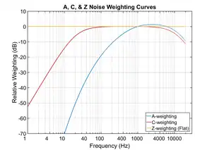 Researchers use different weights to account for noise frequency with intensity, as humans do not perceive sound at the same loudness level.[14] The most commonly used weighted levels are A-weighting, C-weighting, and Z-weighting. A-weighting mirrors the range of hearing, with frequencies of 20 Hz to 20,000 Hz.[14] This gives more weight to higher frequencies and less weight to lower frequencies.[14][19] C-weighting has been used to measure peak sound pressure or impulse noise, similar to loud short-lived noises from machinery in occupational settings.[19][20] Z-weighting, also known as zero-weighting, represents noise levels without any frequency weights.[19][20]