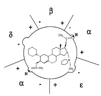 Two functional groups contribute significantly to aminosteroidal neuromuscular blocking potency, it is presumed to enable them to bind the receptor at two points. A bis-quaternary two point arrangement on A and D-ring (binding inter-site) or a D-ring acetylcholine moiety (binding at two points intra-site) are most likely to succeed. A third group can have variable effects.[20] The quaternary and acetyl groups on the A and D ring of pipecuronium prevent it from binding intra-site (binding to two points at the same site). Instead, it must bind as bis-quaternary (inter-site).[6] These structures are very dissimilar from acetylcholine and free pipecuronium from nicotinic or muscarinic side-effects linked to acetylcholine moiety. Also, they protect the molecule from hydrolysis by cholinesterases, which explain its nature of kidney excretion. The four methyl-groups on the quaternary N atoms make it less lipophilic than most aminosteroids. This also affects pipecuroniums metabolism by resisting hepatic uptake, metabolism, and biliary excretion. The length of the molecule (2.1 nm, close to ideal) and its rigidness make pipecuronium the most potent and clean one-bulk bis-quaternary. Even though the N-N distance (1.6 nm) is far away from what is considered ideal, its onium heads are well-exposed, and the quaternary groups help to bring together the onium heads to the anionic centers of the receptors without chirality issues.[20]