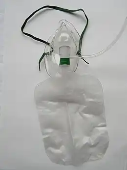 The non-rebreather mask covers both the nose and mouth of the patient and attaches with the use of an elastic cord around the patient's head. The NRB has an attached reservoir bag, typically one liter, that connects to an external oxygen tank or bulk oxygen supply system. Before an NRB is placed on the patient, the reservoir bag is inflated to greater than two-thirds full of oxygen, at a rate of 15 liters per minute (lpm).[1] Approximately ¹⁄₃ of the air from the reservoir is depleted as the patient inhales, and it is then replaced by the flow from the O2 supply. If the bag becomes completely deflated, the patient will no longer have a source of air to breathe.
