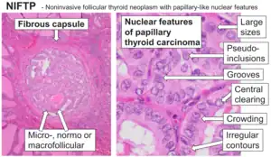 - ↑ Johnson, Daniel N.; Furtado, Larissa V.; Long, Bradley C.; Zhen, Chao Jie; Wurst, Michelle; Mujacic, Ibro; Kadri, Sabah; Segal, Jeremy P.; Antic, Tatjana (2018-03-27). "Noninvasive Follicular Thyroid Neoplasms With Papillary-Like Nuclear Features (NIFTPs) Are Genetically and Biologically Similar to Adenomatous Nodules and Distinct From Papillary Thyroid Carcinomas With Extensive Follicular Growth". Archives of Pathology & Laboratory Medicine. 142 (7): 838–850. doi:10.5858/arpa.2017-0118-OA. ISSN 1543-2165. PMID 29582677.