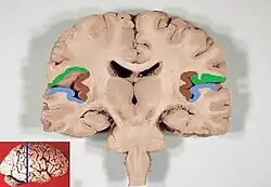 ![]() Parietal operculum (green), temporal operculum (blue), and insular cortex (brown), with red inset showing the position of the brain slice. | |