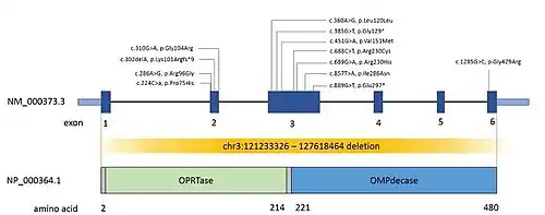 - 1 2 3 4 Winkler, JK; Suttle, DP (July 1988). "Analysis of UMP synthase gene and mRNA structure in hereditary orotic aciduria fibroblasts". American Journal of Human Genetics. 43 (1): 86–94. PMC 1715274. PMID 2837086.
