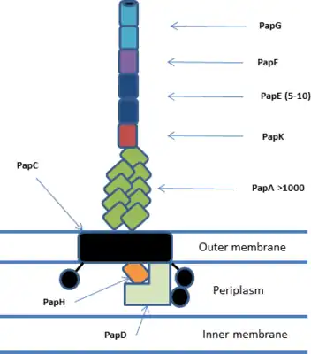 The fimbriae is assembled by a chaperone-usher system, and proteins required for the assembly are expressed by the Pap operon, which is located on pathogenicity islands. The genes of the Pap operon encode five structural proteins (PapA, PapK, PapE, PapF and PapG), four proteins involved in the transport and assembly (PapD, PapH, PapC, PapJ) and two proteins (PapB, PapI) regulating the operon expression.[6][7]