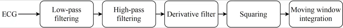 Block diagram of the pre-processing phase of the Pan–Tompkins algorithm.