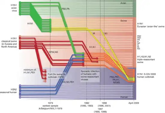 - ↑ McNeil, Donald G. Jr. (30 April 2009). "Virus's tangled genes straddle continents, raising a mystery about its origins". The New York Times. Archived from the original on 7 May 2009. Retrieved 3 December 2023.