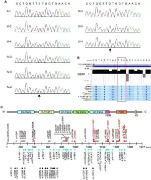 There are a total of 8 mutations that account for the disorder in 8 of 14 studied families. These mutations are clustered in four regions throughout the channel: the linker between domains 2 and 3 (D2-3), the intracellular segment linking segments 4 and 5 in domain 3 (D3S4-5), the linker between domains 3 and 4 (D3-4) and the intracellular segment linking segments 4 and 5 in domain 4 (D4S4-5). The mutations in the D3S4-5 region (I1461T, F1462V and T1461I) are located in or next to an IFM motif that is conserved across all voltage-gated sodium channels. Mutagenesis studies of this region have shown that it acts as part of the inactivation gate, pivoting to block the central pore. Not surprisingly then, the two of these mutations that have received further study show incomplete inactivation. When the IFM motif pivots to block the central pore it interacts with residues in the D3S4-5 region. There are three mutations in this region (V1298F, F1298D and V1299F) that are believed to alter the interaction with the inactivation gate. While this region has been studied by mutagenesis these specific mutations have not all received attention, though they are expected to produce changes similar to the aforementioned IFM region mutations. The M1627K mutation in the D4S4-5 region may also affect a residue involved in interacting with the IFM inactivation motif. This would explain the observed alteration of inactivation and the broadening of a window current. One of the affected families with the R996C mutation, pedigree 12, has a single individual who also has the V1298D mutation. The individual in this family with the compound mutation is the most severely affected, suggesting that the R996C mutation may cause a less severe phenotype. The less severe phenotype of the pedigree 4 family is in concordance with this theory. It is unclear how the R996C mutation affects channel function.[2]