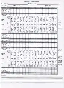 Periodontal charting refers to a chart utilized by a dental care professional (periodontist, dentist, registered dental hygienist) to write and record gingival[1] and overall oral conditions relating to oral and periodontal health or disease.