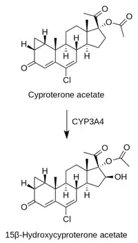 - ↑ Bhargava AS, Seeger A, Günzel P (1977). "Isolation and identification of 15-beta-hydroxy cyproterone acetate as a new metabolite of cyproterone acetate in dog, monkey and man". Steroids. 30 (3): 407–18. doi:10.1016/0039-128x(77)90031-9. PMID 413211. S2CID 54373018.