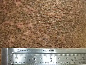 PVA can be characterized by speckled, combined hyper- and hypopigmentation in the plaques or patches of affected skin.[5] Hyperpigmentation is excess coloration, or darkening of the skin,[8] while hypopigmentation is a diminished or pallid coloring to the skin. Pigmentation changes in PVA, apparent in the epidermal (outermost) skin layer, may be attributed to incontinence (leaking out) of melanin from melanocytes into the dermal skin layer below.[5] Inflammation of the skin and cutaneous tissue, common with PVA,[7] also contributes to color changes in the skin, typified by redness. Telangiectasia, the visible "vascular" element of PVA, is the dilation of small blood vessels near the skin surface.[5] Skin atrophy, a wasting-away of the tissue comprising the skin, is a prominent part of PVA and effects the dermal, and particularly the epidermal layer.[5] This, in part, is the result of degenerative liquefaction of the stratum basale (bottom cell-layer) of the epidermis.[5] Atrophy of the skin gives it a thin, dry and wrinkled appearance, which in PVA-affected individuals has been described as "cigarette paper".[7] Hyperkeratosis, a thickening of the stratum corneum (top cell-layer of the epidermis), has also been reported.[5][9]