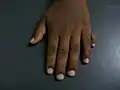 This is the most common situation, in which the extra digit is on the ulnar side of the hand, thus the side of the little finger. This can also be called postaxial polydactyly. It can manifest itself very subtly, for instance only as a nubbin on the ulnar side of the little finger, or very distinctly, as a fully developed finger. Most commonly, the extra finger is rudimentary, consisting of an end phalanx with a nail, and connected to the hand with a small skin pedicle. Mostly one neurovascular bundle can be identified, with no tendons present in the extra digit. In case of a fully developed extra finger, the duplication usually presents itself at the level of the metacarpophalangeal joint. A triplication of the little finger is very rare. Ulnar polydactyly occurs ten times more often in African populations.[14] The incidence in Caucasians is reported as 1 in 1,339 live births, compared with 1 in 143 live births in Africans. Ulnar polydactyly is also often part of a syndrome.[14] In patients with African ancestry ulnar polydactyly mostly occurs isolated, whereas the presentation in Caucasians is often associated with a syndrome,[7] though in a retrospective review, only 4 of 37 cases of ulnar polydactyly in Caucasians were syndromic.[15]