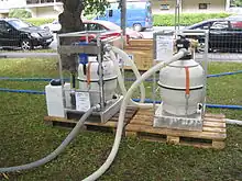 Portable water purification devices are self-contained, easily transported units used to purify water from untreated sources (such as rivers, lakes, and wells) for drinking purposes. Their main function is to eliminate pathogens, and often also of suspended solids and some unpalatable or toxic compounds.