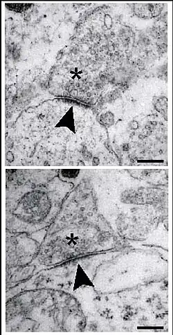 ![]() Ultra-structural analysis of synapses in the brainstem of wild-type (WT)mice at embryonic day 18.5. Synapses of WT neurons in the pre-Bötzinger-complex area exhibit presynaptic vesicles (asterisks), a synaptic cleft and a distinct postsynaptic density (arrowheads). Scale bar, 250 nm. From Heupel et al., 2008 | |