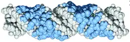 The exact secondary and tertiary structure of protamine is not known with certainty, but several proposals have been published since the 1970s.[22][23][1][24][25][20][26] The broad consensus is that protamine forms beta strand structures that then crosslink through disulphide bonds (and potentially dityrosine and cysteine-tyrosine bonds).[25][20] When protamine P1 binds to DNA, cysteine from the amino terminal of one protamine P1 forms disulfide bonds with the cysteine from the carboxy-terminal of another protamine P1. By neutralizing the backbone charge protamine enables the DNA to more tightly coil.[12][26] The disulfide bonds function to prevent the dissociation of protamine P1 from DNA until the bonds are reduced when the sperm enters the egg.[1] These long protamine polymers may then wrap around the DNA within the major groove.[1][23]