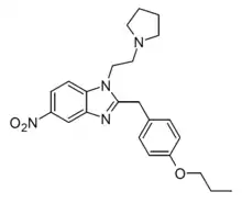 Protonitazepyne (N-pyrrolidino protonitazene) is a benzimidazole derivative with opioid effects, which has been sold as a designer drug over the internet, first being mentioned in mid 2022 and definitively identified in drug seizures in Canada in early 2023. It is an analogue of etonitazene where the ethoxy group has been extended to propoxy, and the N,N-diethyl substitution has been cyclised into a pyrrolidine ring. While formal studies into its pharmacology have yet to be carried out, it is believed to be slightly less potent than the ethoxy analogue etonitazepyne but still a potent opioid.[1][2]