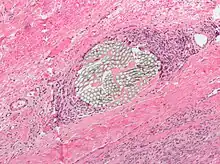 Micrograph of a H&E stained tissue section showing a non-absorbable multi-filament surgical suture with a surrounding foreign-body giant cell reaction