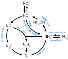 The nitrogen cycle is a vital part of life, and is essential to carry out biosynthesis of nitrogen containing compounds.[5] Nitrogen is inaccessible to most organisms unless it is fixed, and this process can only be carried out by certain classes of prokaryotes.[4] Putrefying bacteria use amino acids or urea as an energy source to decompose dead organisms. In the process, they produce ammonium ions. Nitrifying bacteria then convert this ammonium into nitrate by oxidation, which can then be used by plants to create more proteins thus completing the nitrogen cycle.[6] This process is called nitrification. Energy from this oxidation reaction can also be used to synthesize organic compounds in a process called chemosynthesis.[7]