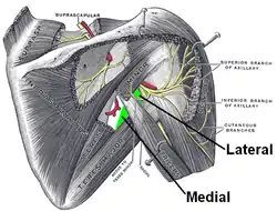 ![]() Suprascapular and axillary nerves of right side, seen from behind. Quadrangular space is the lateral space, labeled in green at center right. Axillary nerve is visible entering it. | |