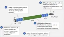 The in vitro transcribed mRNA has the same structural components as natural mRNA in eukaryotic cells. It has a 5' cap, a 5'-untranslated region (UTR) and 3'-UTR, an open reading frame (ORF), which encodes the relevant antigen, and a 3'-poly(A) tail. By modifying these different components of the synthetic mRNA, the stability and translational ability of the mRNA can be enhanced, and in turn, the efficacy of the vaccine improved.[60]