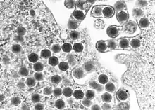 | Transmission electron micrograph of ranaviruses (dark hexagons) gathering at the cell border and leaving the cell via a process called "budding". | |