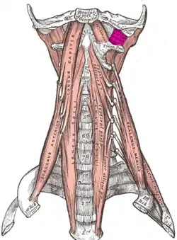 ![]() Posterior view of neck bones (rectus capitis lateralis muscle shown in red) | |
