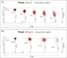 Advanced Computational Fluid Dynamics (CFD) showed that at wind speeds varying from 4 to 15 km/h, respiratory droplets may travel up to 6 meters.[10][11]