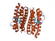 Rubrerythrin (RBR) is a non-heme iron-containing metalloprotein involved in oxidative stress tolerance within anaerobic bacteria.[1] It contains a di-iron active site, where peroxide is reduced into two water molecules, and a mono-iron rubredoxin-like domain thought to be involved in electron transfer.[2] A majority of known RBR families are utilized as peroxide "scavengers" to defend organisms against oxidative stress.