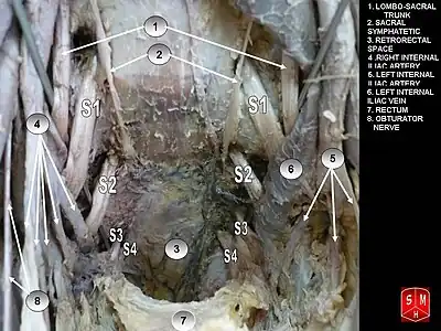 In human anatomy, the sacral plexus is a nerve plexus which provides motor and sensory nerves for the posterior thigh, most of the lower leg and foot, and part of the pelvis. It is part of the lumbosacral plexus and emerges from the lumbar vertebrae and sacral vertebrae (L4-S4).[1] A sacral plexopathy is a disorder affecting the nerves of the sacral plexus, usually caused by trauma, nerve compression, vascular disease, or infection. Symptoms may include pain, loss of motor control, and sensory deficits.