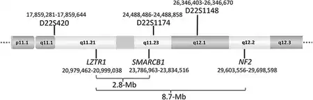 | Diagream of chromosome 22 indicating the location of the LZTR1, SMARCB1, and NF2 genes.[1] In individuals with schwannomatosis, greater than fifty different mutations in the LZTR1 gene are observed.[2] | |