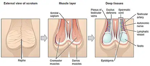 In most terrestrial mammals, the scrotum (pl.: scrotums or scrota; possibly from Latin scortum, meaning "hide" or "skin")[1][2] or scrotal sac is a part of the external male genitalia located at the base of the penis. It consists of a sac of skin containing the external spermatic fascia, testicles, epididymides, and vasa deferentia. The scrotum will usually tighten during penile erection and when exposed to cold temperatures.