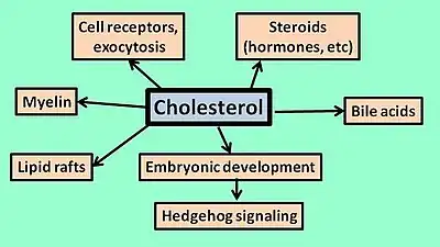 One particularly relevant pathway in which cholesterol takes place is the Hedgehog signaling pathway. This pathway is very important during embryonic development, and involved in deciding the fate of cells (i.e., which tissue they need to migrate to). Hedgehog proteins are also involved in the transcription of genes that regulate cell proliferation and differentiation. Cholesterol is important to this pathway because it undergoes covalent bonding to Hedgehog proteins, resulting in their activation. Without cholesterol, the signaling activity is disrupted and cell differentiation may be impaired.[14]