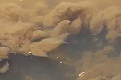 | Submerged S. natans colonies with floating insect in the lower right for scale. Beige color shown is typical of aerated sewage treatment plants, but color may vary through grey toward black downstream of septic sewage or into brighter orange from precipitated ferric oxide. | |
