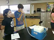 This spirometer measures the flow rate of gases by detecting pressure differences across fine mesh. One advantage of this spirometer is that the subject can breathe fresh air during the experiment.[27]