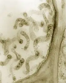 | Corn stunt Spiroplasma in phloem cells. Thick section (0.4 micrometers) observed in a TEM. Magnified 75,000X. | |