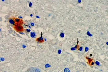 Immunohistochemical analysis - vessels of brain of individual with fatal Rocky Mountain spotted fever