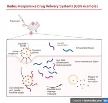 Redox responsive drug delivery systems rely on the natural reduction-oxidation reactions that occur in the body and the availability of reducing or oxidative-agents in the extracellular and intracellular space.[2] In redox-stimulated responses, drug carriers enter the intracellular space through endocytosis and are destabilized by intracellular concentrations of reducing agents, leading to their disassembly and the delivery of the therapeutic intracellularly.[2] For example, the use of redox stimulated drug delivery is primarily attributed to the high intracellular concentration of glutathione (GSH) as compared to the much lower extracellular concentration of GSH.[6] GSH acts as a reducing agent in redox reactions, allowing it to cleave bonds like disulfide bonds. The increased level of GSH in tumor cells combined with its ability to cleave disulfide bonds has led to the development of drug delivery systems, such as polymeric micelles, synthesized with disulfide bonds that are subsequently cleaved by intracellular GSH, which cause the breakdown of the micelle and the intracellular release of the encapsulated therapeutic.[5]