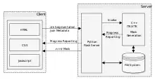 The server side (back-end) handles client requests via C, C++ and Python.[21] It interfaces to common open source libraries and software tools like the Insight Toolkit,[22] the Visualization Toolkit (VTK),[23] the X Toolkit (XTK)[24] and Slice:Drop.[25] The server communication is handled by AJAX requests[26] were needed.